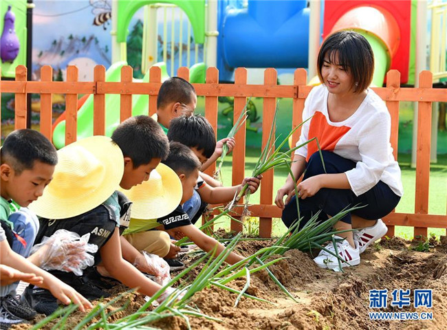 6月17日,樂亭縣大相各莊鄉(xiāng)幼兒園老師在勞動實(shí)踐基地的小菜園里教孩子們栽種大蔥。新華社記者楊世堯攝