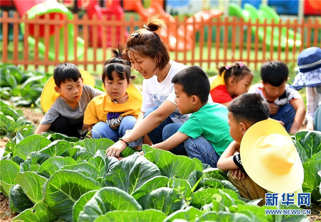 6月17日,樂亭縣大相各莊鄉(xiāng)幼兒園老師在勞動實(shí)踐基地的小菜園里給孩子們講解甘藍(lán)菜的生長過程。新華社記者楊世堯攝