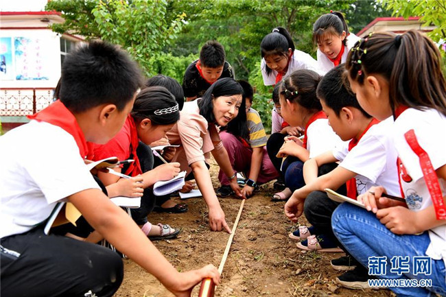6月17日,樂亭縣汀流河鎮(zhèn)楊各莊小學(xué)的老師在校園勞動實(shí)踐基地內(nèi)為學(xué)生講解土地丈量知識。新華社記者楊世堯攝