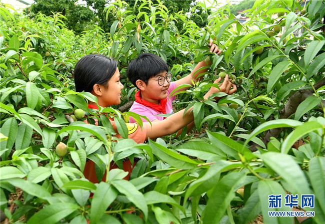 6月17日,樂亭縣毛莊鎮(zhèn)松各莊小學(xué)的學(xué)生在校園勞動實(shí)踐基地果園內(nèi)觀察桃子的長勢。新華社記者楊世堯攝