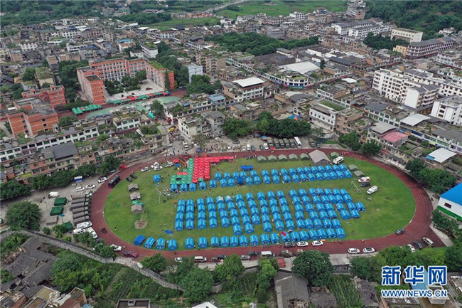 6月18日無(wú)人機(jī)拍攝的長(zhǎng)寧縣雙河中學(xué)安置點(diǎn)。 新華社發(fā)(曾朗 攝)