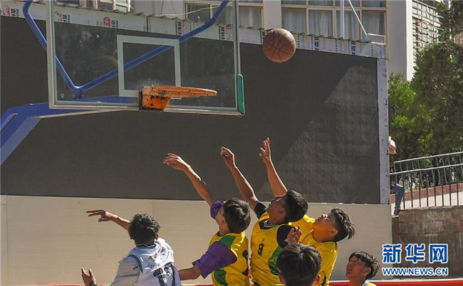 鹽井中學(xué)的學(xué)生們在體育課上打籃球(6月6日攝)。年輕的藏族女教師坐在鋼琴前,手指靈動地彈奏樂曲,兩名學(xué)生拉起弦子伴奏,三十多名學(xué)生站成四排,齊聲合唱。學(xué)校籃球場上數(shù)名身材高大的學(xué)生,正在體育老師的組織下進(jìn)行激烈的分組對抗,不一會兒,學(xué)生們個(gè)個(gè)汗流浹背。綜合樓三樓的化學(xué)實(shí)驗(yàn)室內(nèi),身穿白色大褂的學(xué)生,分成若干小組,正在做簡單的化學(xué)實(shí)驗(yàn)。這一幕幕,同時(shí)出現(xiàn)在西藏昌都市芒康縣鹽井中學(xué)。新華社記者晉美多吉攝