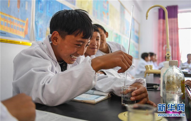 鹽井中學(xué)的學(xué)生們在上化學(xué)課(6月6日攝)。年輕的藏族女教師坐在鋼琴前,手指靈動地彈奏樂曲,兩名學(xué)生拉起弦子伴奏,三十多名學(xué)生站成四排,齊聲合唱。學(xué)?;@球場上數(shù)名身材高大的學(xué)生,正在體育老師的組織下進(jìn)行激烈的分組對抗,不一會兒,學(xué)生們個(gè)個(gè)汗流浹背。綜合樓三樓的化學(xué)實(shí)驗(yàn)室內(nèi),身穿白色大褂的學(xué)生,分成若干小組,正在做簡單的化學(xué)實(shí)驗(yàn)。這一幕幕,同時(shí)出現(xiàn)在西藏昌都市芒康縣鹽井中學(xué)。新華社記者晉美多吉攝