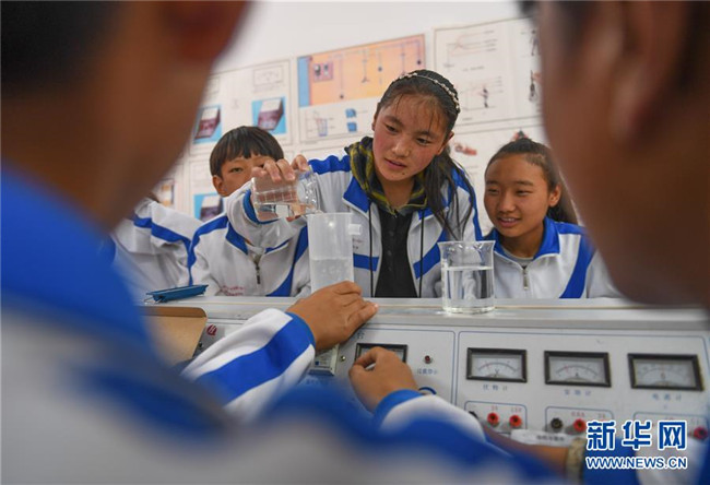 鹽井中學(xué)的學(xué)生們在上物理課(6月6日攝)。年輕的藏族女教師坐在鋼琴前,手指靈動地彈奏樂曲,兩名學(xué)生拉起弦子伴奏,三十多名學(xué)生站成四排,齊聲合唱。學(xué)?;@球場上數(shù)名身材高大的學(xué)生,正在體育老師的組織下進(jìn)行激烈的分組對抗,不一會兒,學(xué)生們個(gè)個(gè)汗流浹背。綜合樓三樓的化學(xué)實(shí)驗(yàn)室內(nèi),身穿白色大褂的學(xué)生,分成若干小組,正在做簡單的化學(xué)實(shí)驗(yàn)。這一幕幕,同時(shí)出現(xiàn)在西藏昌都市芒康縣鹽井中學(xué)。新華社記者晉美多吉攝