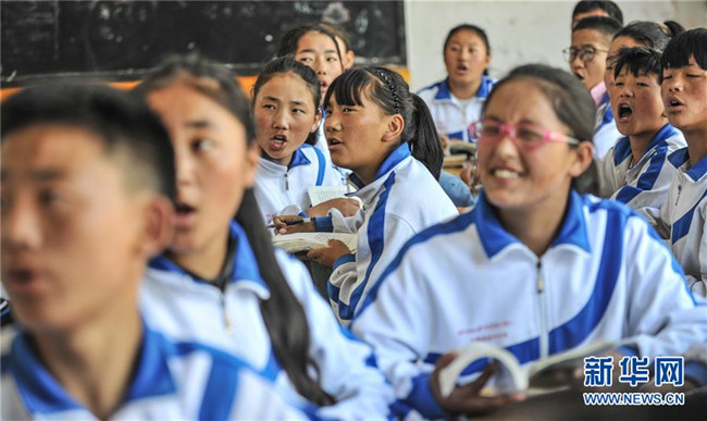 鹽井中學(xué)的學(xué)生們在上英語課(6月6日攝)。年輕的藏族女教師坐在鋼琴前,手指靈動地彈奏樂曲,兩名學(xué)生拉起弦子伴奏,三十多名學(xué)生站成四排,齊聲合唱。學(xué)校籃球場上數(shù)名身材高大的學(xué)生,正在體育老師的組織下進(jìn)行激烈的分組對抗,不一會兒,學(xué)生們個(gè)個(gè)汗流浹背。綜合樓三樓的化學(xué)實(shí)驗(yàn)室內(nèi),身穿白色大褂的學(xué)生,分成若干小組,正在做簡單的化學(xué)實(shí)驗(yàn)。這一幕幕,同時(shí)出現(xiàn)在西藏昌都市芒康縣鹽井中學(xué)。新華社記者晉美多吉攝