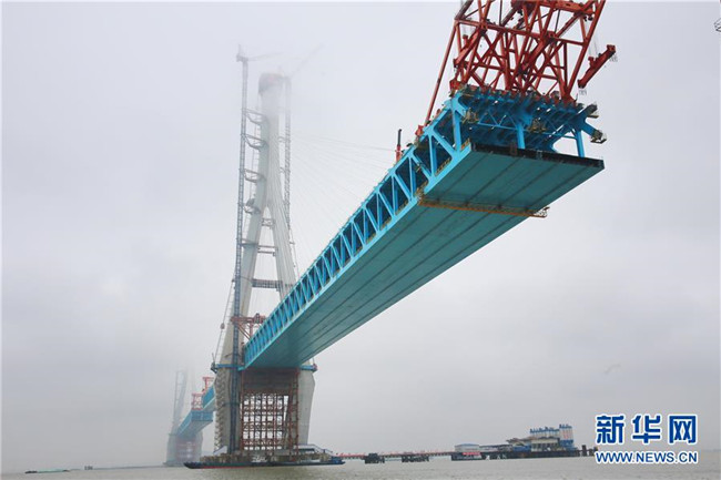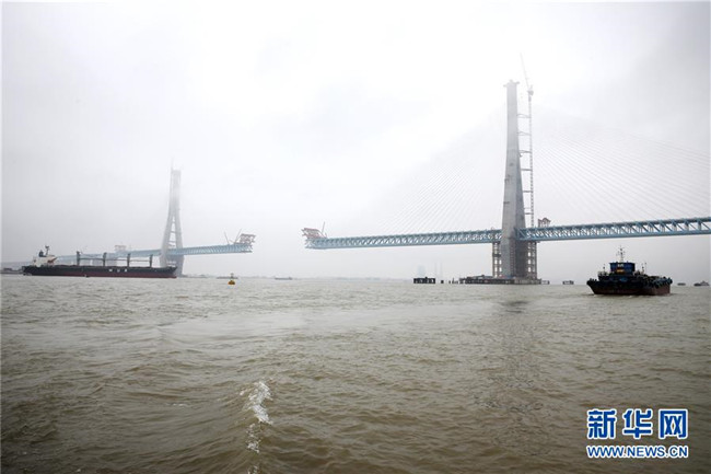 當(dāng)日,滬通長江大橋南主塔順利封頂。至此,該橋兩座高達(dá)330米的主塔全部建成,標(biāo)志著世界最大跨度公鐵兩用斜拉橋建設(shè)取得了關(guān)鍵性進(jìn)展。滬通長江大橋全長11072米,主橋長2296米,主跨1092米,是滬通鐵路全線的控制性工程,設(shè)計(jì)為上層6車道高速公路,下層4線鐵路。新華社發(fā)(許叢軍攝)