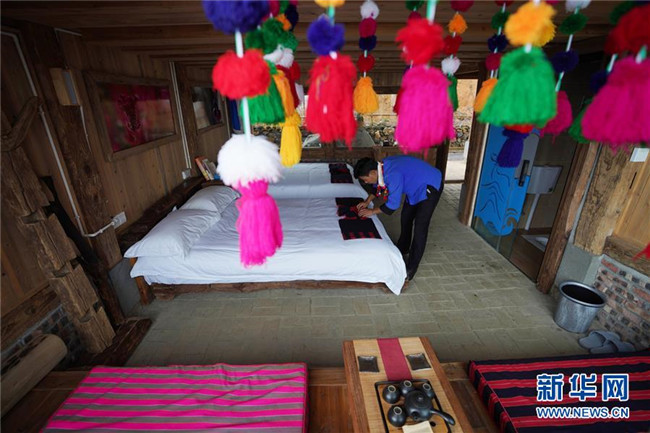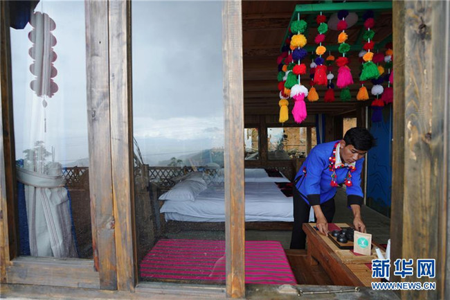 在云南省芒市三臺(tái)山德昂族鄉(xiāng)出冬瓜老寨,趙臘退在他的民宿“上上居”整理客房床鋪(6月19日攝)。 新華社記者 秦晴 攝