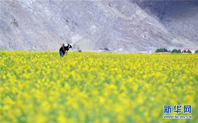 7月2日,拉薩市堆龍德慶區(qū)德慶鄉(xiāng)的村民在打理油菜花田。近日,西藏各地的油菜花盛開,呈現出生機勃勃的夏日美景。新華社記者李鑫攝