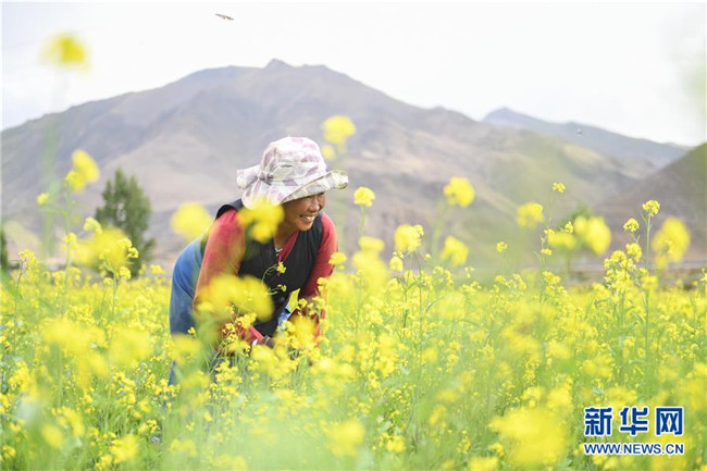 7月2日,拉薩市堆龍德慶區(qū)朗巴鄉(xiāng)村民玉珍在打理油菜花田。近日,西藏各地的油菜花盛開,呈現出生機勃勃的夏日美景。新華社記者晉美多吉攝
