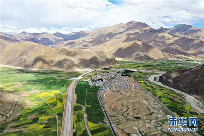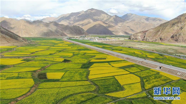 7月2日在拉薩市堆龍德慶區(qū)德慶鄉(xiāng)拍攝的油菜花田(無人機拍攝)。近日,西藏各地的油菜花盛開,呈現出生機勃勃的夏日美景。新華社記者普布扎西攝