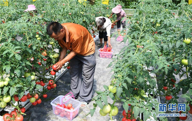 7月2日,馬灌鎮(zhèn)果園村村民在無土栽培西紅柿大棚內(nèi)采摘。新華社記者 王全超 攝