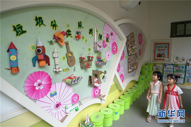 7月4日,德清縣乾元鎮(zhèn)第一幼兒園老師向孩子們講解垃圾分類知識。新華社記者 林善傳 攝