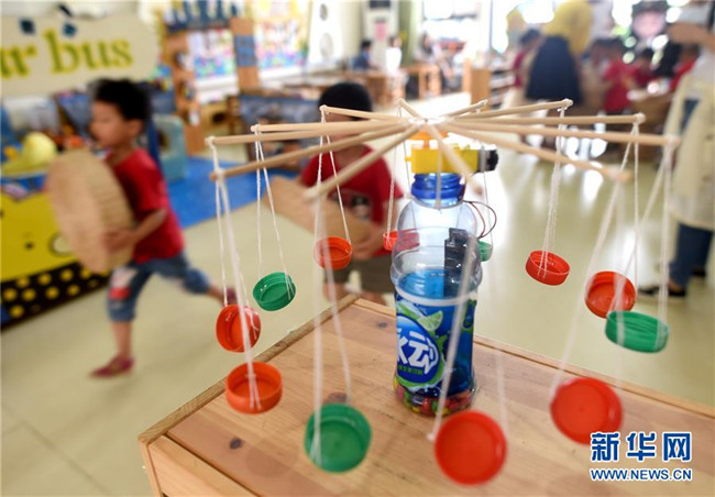 這是7月4日拍攝的德清縣乾元鎮(zhèn)第一幼兒園小朋友們通過廢物回收制作的手工藝品。新華社記者 韓傳號 攝