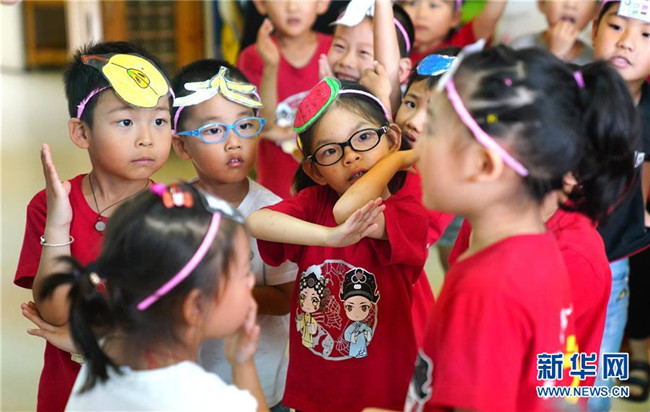 7月4日,孩子們頭戴不同種類垃圾的圖案,在游戲中交流。新華社記者 鮑菲菲 攝