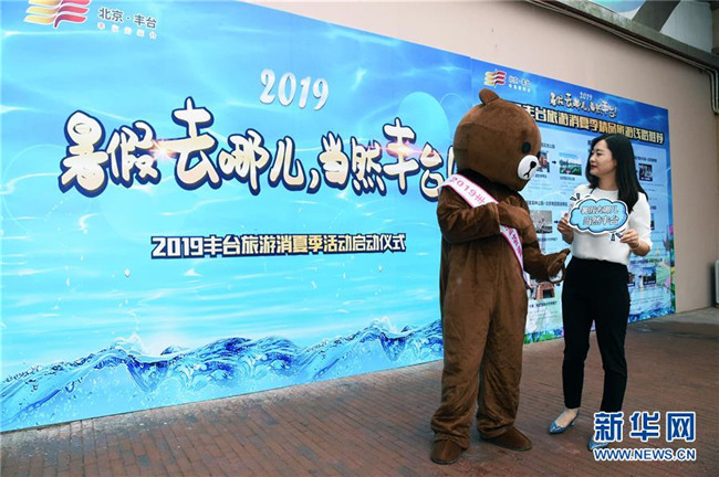 7月6日,市民在2019豐臺旅游消夏季活動啟動儀式上與吉祥物互動。 新華社發(fā)(任超 攝)