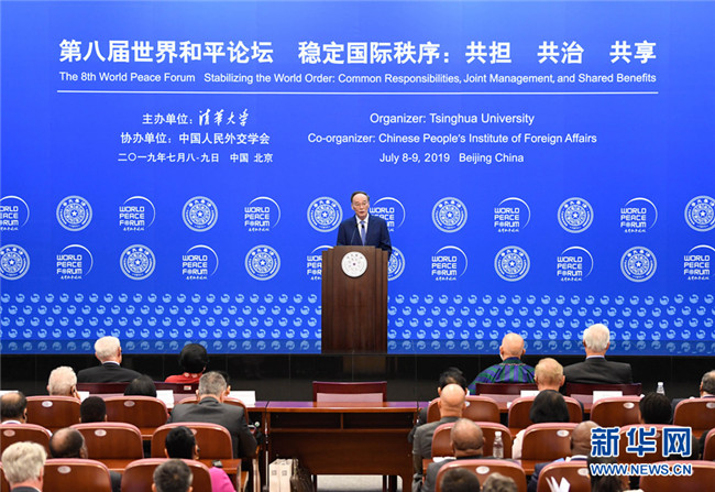 7月8日,以“穩(wěn)定國(guó)際秩序:共擔(dān)、共治、共享”為主題的第八屆世界和平論壇在清華大學(xué)舉行,國(guó)家副主席王岐山出席開(kāi)幕式并致辭。 新華社記者 申宏 攝