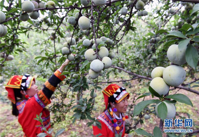 兩名彝族女孩在云南元謀縣新華鄉(xiāng)新平村果園采摘桃李(7月13日攝)。新華社記者 楊宗友 攝