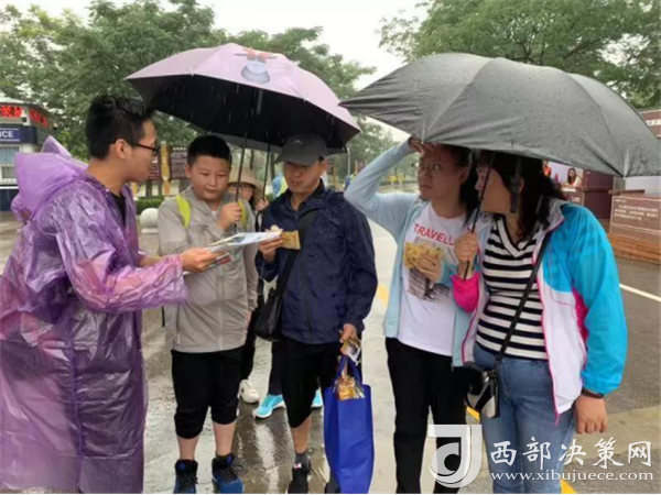 志愿者向游客宣傳環(huán)保小知識并送上景區(qū)宣傳彩頁