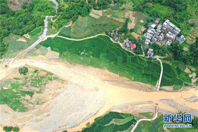 廣西河池市東蘭縣隘洞鎮(zhèn)坡拉村高更屯兩條通屯道路均被洪水沖毀(7月16日無人機(jī)拍攝)。