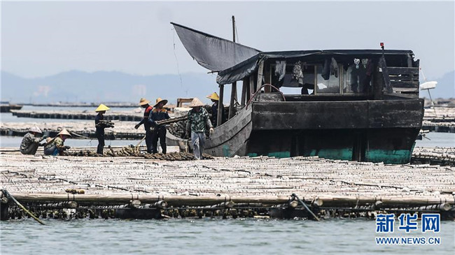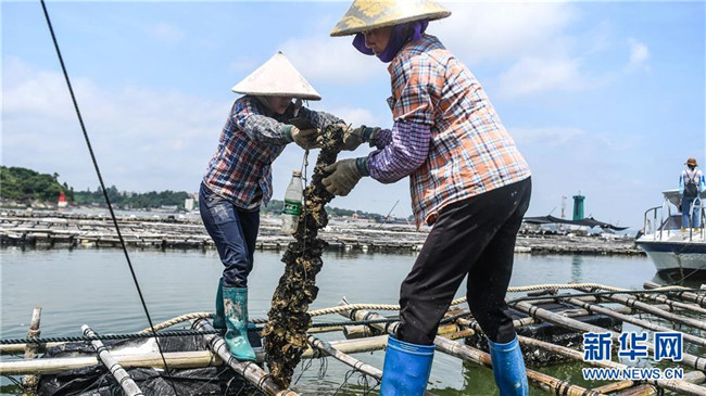 村民在蠔排上提取蠔柱收獲大蠔(7月20日攝)。 新華社記者 張愛林 攝