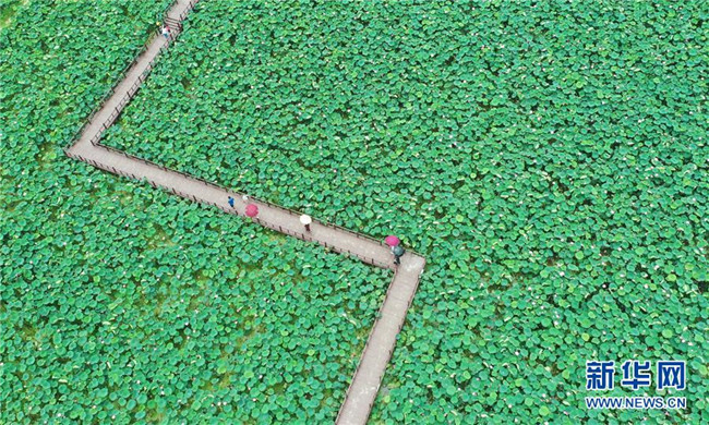 在江西省南昌市新建區(qū)聯(lián)圩鎮(zhèn),游客在當?shù)氐那М€荷花園觀賞游玩(7月20日無人機拍攝)。