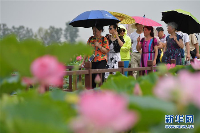 在江西省南昌市新建區(qū)聯(lián)圩鎮(zhèn),游客在當?shù)氐那М€荷花園觀賞游玩(7月20日攝)。新華社記者 彭昭之 攝