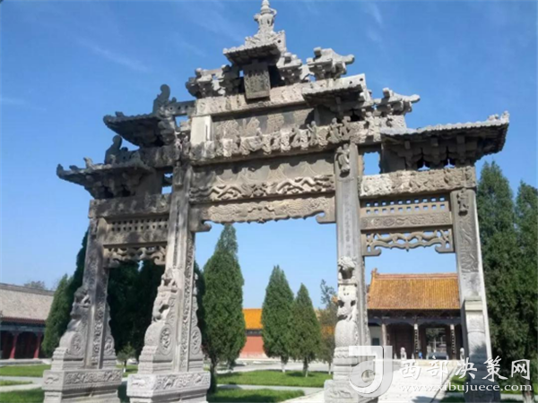 “天威咫尺”石牌樓明萬歷年所建,結構為四柱三開間五樓式金青石牌樓。結構精巧,內容豐富,雕刻手法細致、全面。運用圓雕、浮雕、線雕、透雕等各種雕刻手法。