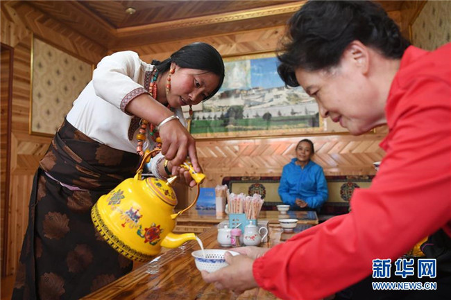 甘肅省甘南藏族自治州碌曲縣尕海鎮(zhèn)尕秀村村民扎西拉毛(左)在自家的牧家樂里為游客倒奶茶(2018年8月10日攝)。新華社記者 陳斌 攝