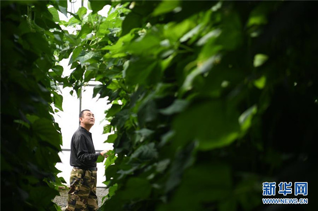 甘肅省酒泉市肅州區(qū)總寨鎮(zhèn)村民范立德在戈壁農(nóng)業(yè)產(chǎn)業(yè)園的日光溫室內(nèi)查看蔬菜生長情況(2018年4月18日攝)。新華社記者 陳斌 攝