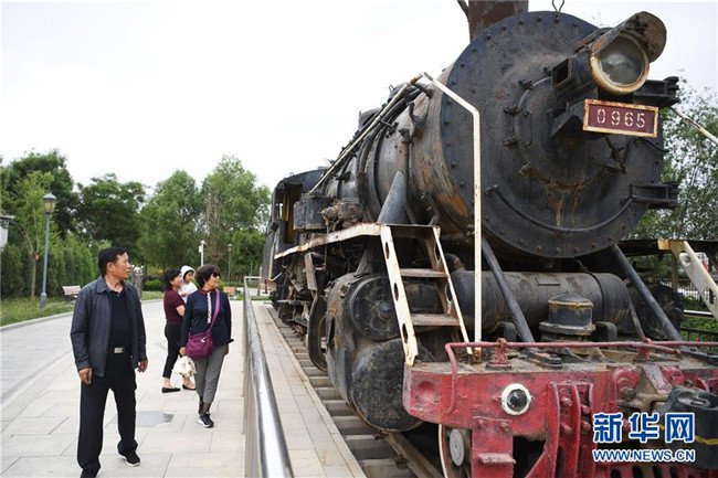 游客在甘肅省白銀市火焰山國家礦山公園內(nèi)參觀蒸汽機車(2019年6月11日攝)。新華社記者 陳斌 攝