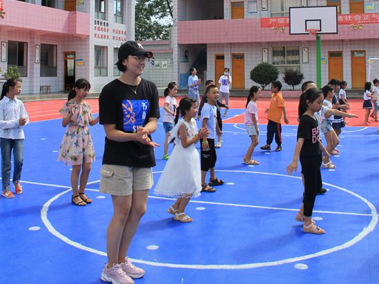 清華大學(xué)“19黔行”支教隊(duì)員和小朋友們一起做課間操。鄔雄亮/攝