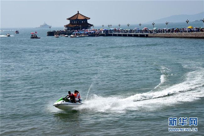 8月6日,游客在青島棧橋景區(qū)海邊游玩。 暑期旅游旺季,海濱城市青島各景區(qū)、景點游人如織。 新華社記者 李紫恒 攝
