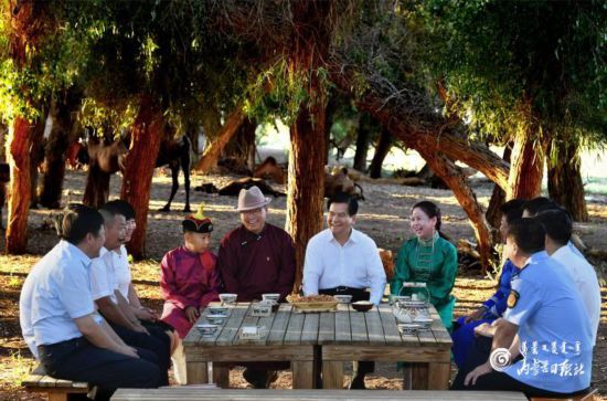 在烏蘭格日勒嘎查黨支部書記額日登達(dá)來(lái)家的院子里,李紀(jì)恒與當(dāng)?shù)芈糜螐臉I(yè)人員及文旅、公安、衛(wèi)生、食品監(jiān)管等部門負(fù)責(zé)人圍坐在一起,詳細(xì)了解旅游業(yè)發(fā)展情況,傾聽他們的意見建議。他說(shuō),阿拉善盟旅游資源極為獨(dú)特、充滿魅力,旅游業(yè)發(fā)展前景無(wú)限。要堅(jiān)持保護(hù)與開發(fā)并重,加強(qiáng)各類軟硬件建設(shè),強(qiáng)化市場(chǎng)監(jiān)管,提升服務(wù)質(zhì)量,讓游客住得舒心、吃得放心、玩得開心,讓胡楊林更美、旅游業(yè)更火、老百姓更富。