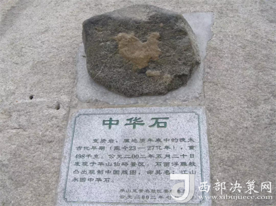 “中華石”于2002年5月20日在華山仙峪景區(qū)被發(fā)現。在淡墨色花崗巖石面上,浮雕般凸現出一塊白色石圖,此圖酷似現制中國版圖,十分形象通真。該石重約498千克,云母花崗巖石,大約形成于三千萬年前的白堊時期,現置北峰。(供稿:華旅集團營銷中心)
