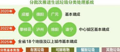征求意見(jiàn)稿提出將加快建立分類投放、分類收集、分類運(yùn)輸、分類處置的生活垃圾處理系統(tǒng),促進(jìn)城鄉(xiāng)生活垃圾減量化、資源化、無(wú)害化,統(tǒng)籌推進(jìn)其他固體廢物處理處置,努力改善城鄉(xiāng)人居環(huán)境。到2020年,成都、德陽(yáng)、廣元3個(gè)國(guó)家重點(diǎn)城市基本建成生活垃圾分類處理系統(tǒng),生活垃圾回收利用率達(dá)到35%以上;到2022年,攀枝花、瀘州、綿陽(yáng)、遂寧4個(gè)省級(jí)示范城市的中心城區(qū)基本建成生活垃圾分類處理系統(tǒng);到2025年,全省18個(gè)地級(jí)及以上城市基本建成生活垃圾分類處理系統(tǒng)。