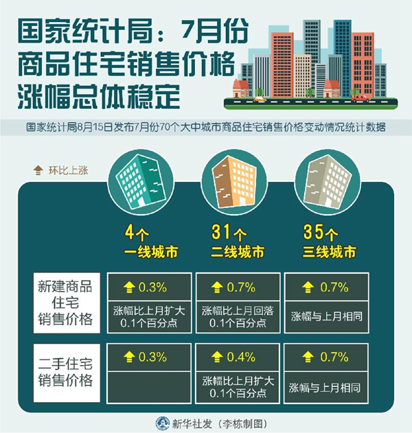 國(guó)家統(tǒng)計(jì)局15日發(fā)布7月份70個(gè)大中城市商品住宅銷售價(jià)格變動(dòng)情況統(tǒng)計(jì)數(shù)據(jù)。統(tǒng)計(jì)顯示,7月份,商品住宅銷售價(jià)格漲幅總體穩(wěn)定。從同比看,一二三線城市新建商品住宅和二手住宅銷售價(jià)格同比漲幅不同程度回落,或與上月相同。