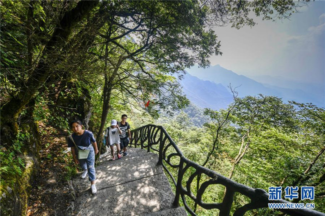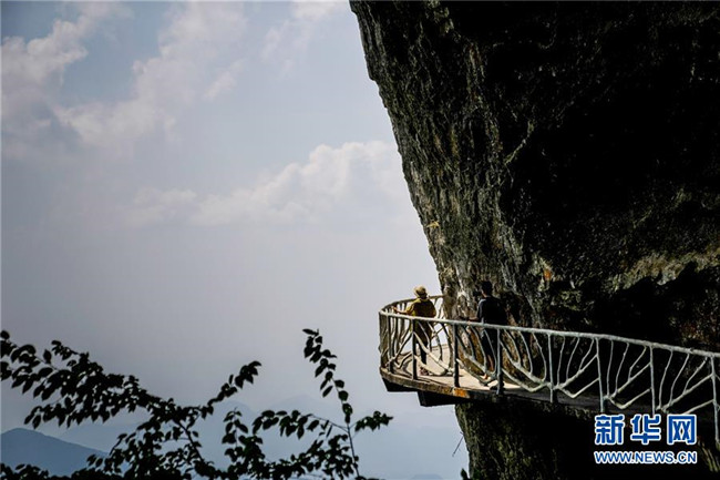 游客在重慶金佛山風(fēng)景區(qū)內(nèi)的絕壁棧道上游覽體驗(yàn)(8月20日攝)。重慶市南川區(qū)的金佛山風(fēng)景區(qū)屬典型的喀斯特地貌,風(fēng)景秀美,吸引了不少游客。新華社記者劉潺攝