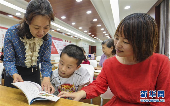 老師(前左)和家長(前右)一起在永清縣城區(qū)街道公益書屋指導(dǎo)孩子誦讀(8月20日攝)。新華社記者 李曉果 攝