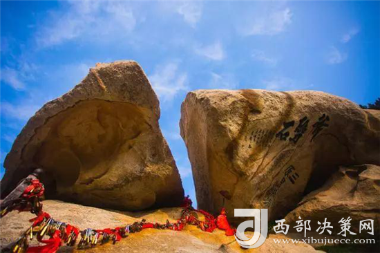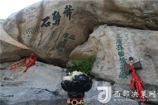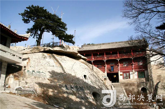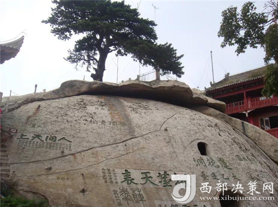 西峰上景觀比比皆是,有翠云宮、蓮花洞、巨靈足、斧劈石、舍身崖等,并伴有許多美麗的神話傳說(shuō)。峰上崖壁題刻遍布,工草隸篆,琳瑯滿目。峰北絕頂叫西石樓峰,峰上楊公塔為楊虎城將軍所建,塔上有楊虎城將軍親筆題辭。塔下巖石上有"枕破鴻蒙"題刻,是書法家王鐸手跡。