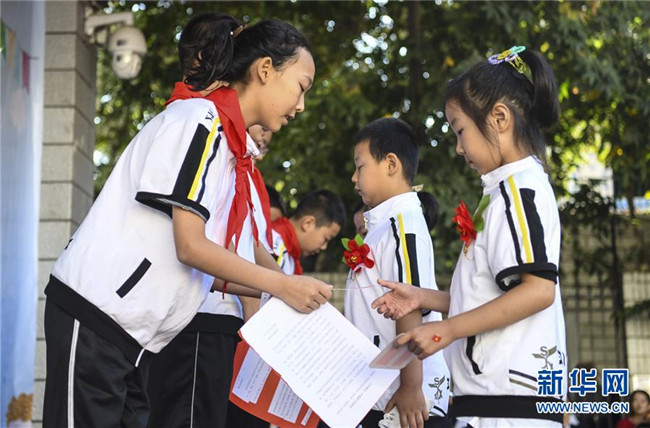 9月4日,新疆教育學(xué)院實(shí)驗(yàn)小學(xué)校園內(nèi),一年級(jí)新生在六年級(jí)學(xué)生的指導(dǎo)下學(xué)習(xí)握拳宣讀誓言。