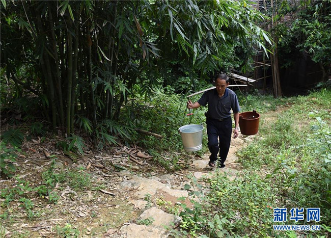 在廣西天等縣進(jìn)結(jié)鎮(zhèn)愛樂村龍坡屯,龍坡教學(xué)點老師黃明料在教學(xué)點附近農(nóng)家挑水回學(xué)校給學(xué)生做午飯(2015年9月10日攝)。新華社記者 陸波岸 攝