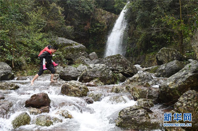 在廣西灌陽縣洞井瑤族鄉(xiāng)野豬殿村,野豬殿村小學(xué)老師周運雄放午學(xué)后背著一名學(xué)生走過被流水淹沒的路段回家(2016年3月22日攝)。新華社記者 陸波岸 攝