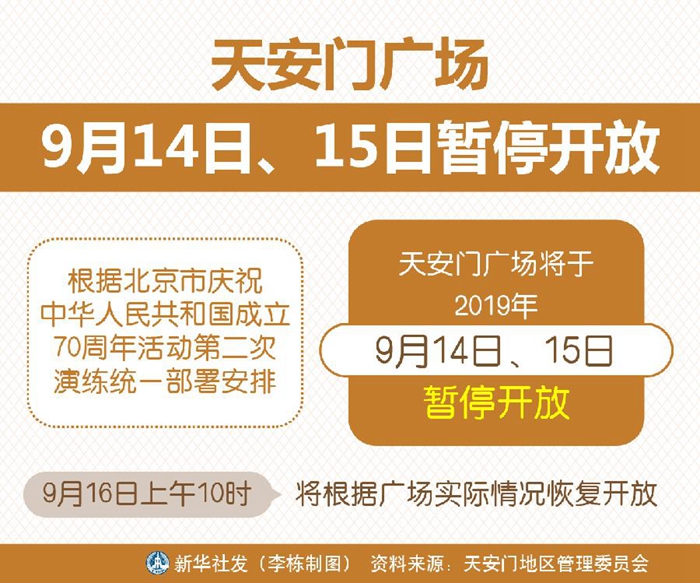 記者從天安門地區(qū)管理委員會(huì)獲悉,根據(jù)北京市慶祝中華人民共和國(guó)成立70周年活動(dòng)第二次演練統(tǒng)一部署安排,天安門廣場(chǎng)將于2019年9月14日、15日暫停開(kāi)放。9月16日上午10時(shí),將根據(jù)廣場(chǎng)實(shí)際情況恢復(fù)開(kāi)放。(記者魯暢)