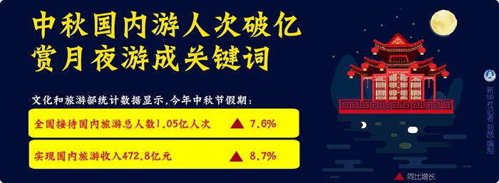 文化和旅游部統(tǒng)計(jì)數(shù)據(jù)顯示,今年中秋節(jié)假期,全國(guó)接待國(guó)內(nèi)旅游總?cè)藬?shù)1.05億人次,同比增長(zhǎng)7.6%;實(shí)現(xiàn)國(guó)內(nèi)旅游收入472.8億元,同比增長(zhǎng)8.7%。