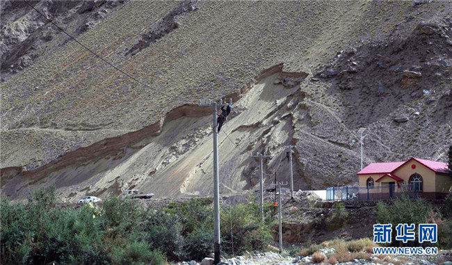 在新疆喀什地區(qū)塔什庫(kù)爾干塔吉克自治縣馬爾洋鄉(xiāng),工人在登桿布線(9月7日攝)。 新華社記者 張嘯誠(chéng) 攝