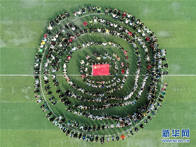 9月18日,邢臺技師學(xué)院的學(xué)生參加快閃活動“我和國旗有個約會”。