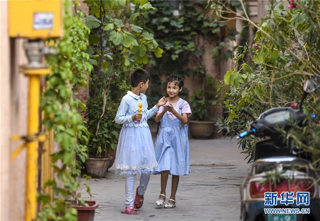 在新疆喀什古城景區(qū)內(nèi),當(dāng)?shù)貎擅∨笥炎咴谙锏纼?nèi)(8月12日攝)。新華社記者 王菲 攝