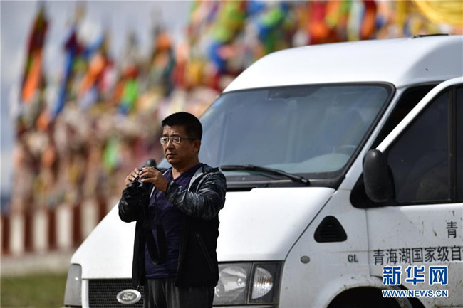 9月24日,青海湖國(guó)家級(jí)自然保護(hù)區(qū)管理局的巡湖觀測(cè)人員王延明在青海湖畔進(jìn)行觀測(cè)。