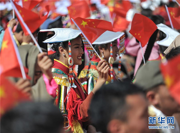 9月29日,觀眾身著民族特色服裝參加聯(lián)歡活動。新華社記者晉美多吉攝