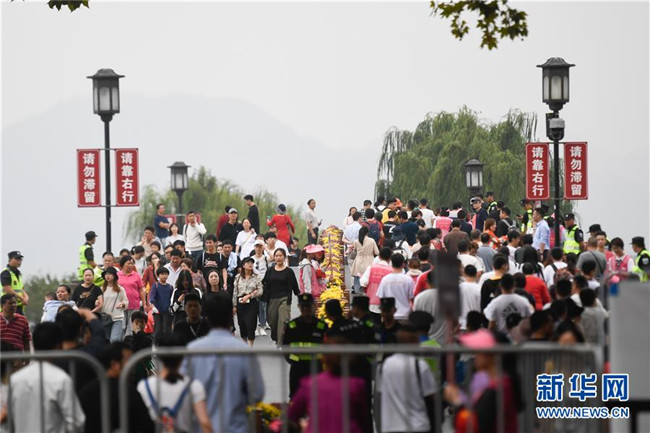 10月7日,杭州西湖風(fēng)景區(qū)的斷橋上游人絡(luò)繹不絕。經(jīng)文化和旅游部綜合測算,2019年國慶七天全國共接待國內(nèi)游客7.82億人次,同比增長7.81%;實現(xiàn)國內(nèi)旅游收入6497.1億元,同比增長8.47%。新華社記者 黃宗治 攝